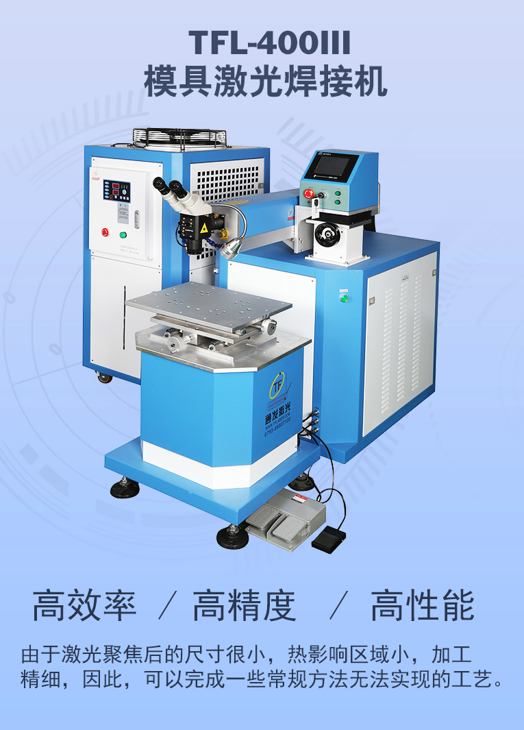 TFL-400Ⅲ型模具激光焊機是通發(fā)激光公司自主研發(fā)的一款大功率激光焊接機,采用通發(fā)自主研發(fā)的二代精密雙燈電源為燈泵浦驅(qū)動電源,配置觸摸屏,操作更方便。主機具備激光頭手搖升降與工作臺按鈕電動升降實現(xiàn)焊接不同厚度模具的激光焊加工。本款機型更適用于各類大功率、大面積激光修補的模具。由于激光功率大,同時可激光焊接鈹銅模具,鋁材模具或鋁材零件。在大面積激光修補模具時,可以使用更粗的焊絲,激光焊接效率大幅提升。